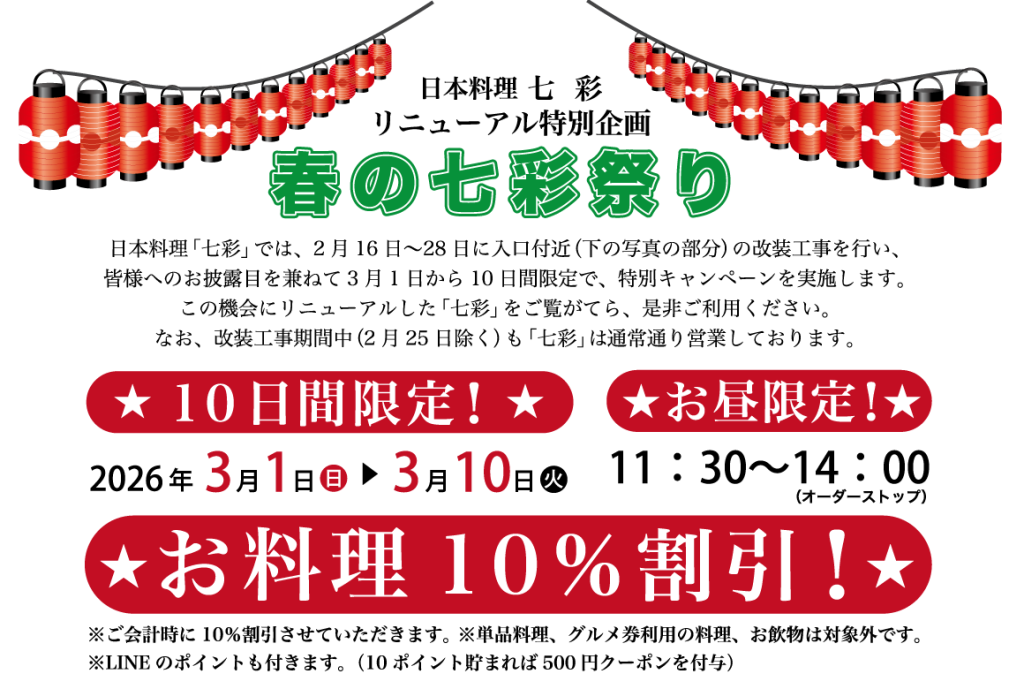 お披露目を兼ねて、3月1日から10日間限定で、七彩祭りを開催いたします。