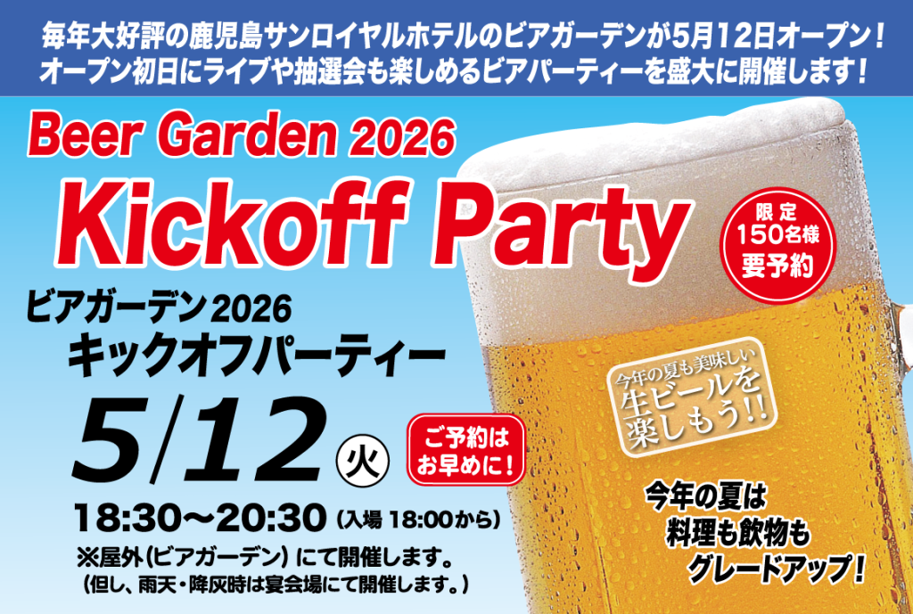 毎年大好評の鹿児島サンロイヤルホテルのビアガーデンが5月12日にオープン!