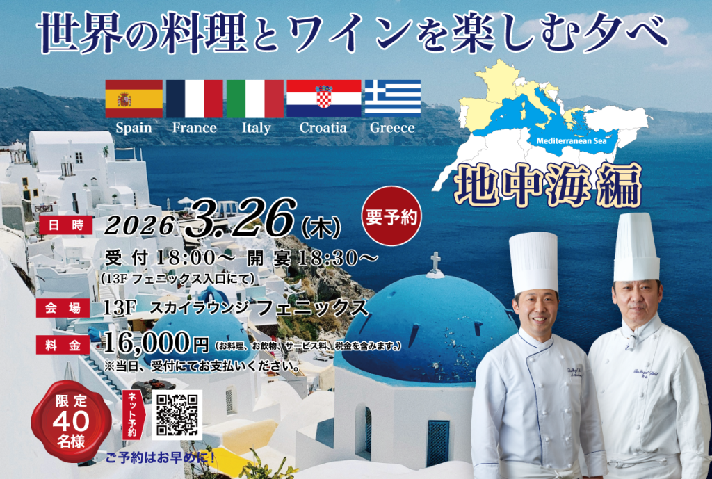 天川料理長と倉山シェフのコラボレーション企画「世界の料理とワインを楽しむ夕べ」の第6弾。今回は、 “地中海” がテーマ。2人が情熱を注ぎ、地中海の北部面する国々伝統料理をアレンジし作り上げるこの日限りのスペシャルディナーをご用意いたします。料理に合わせて厳選した5種類のワインと共にお楽しみください。