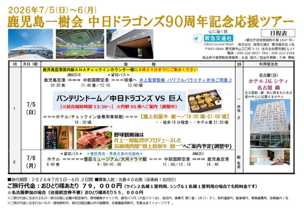 この度 鹿児島一樹会 発足 2 年目を迎えま して 「中日ドラゴンズ 90 周年記念応援ツアー」を開催することとなりました。
