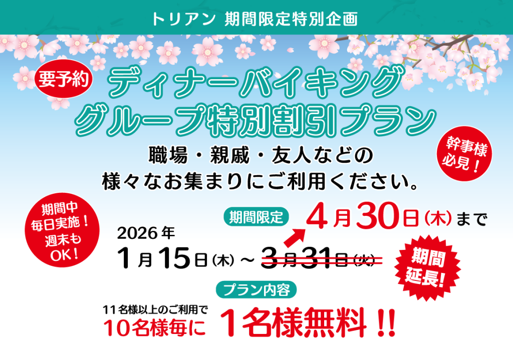 【トリアン】グループ特別割引プラン 4/30まで期間延長!