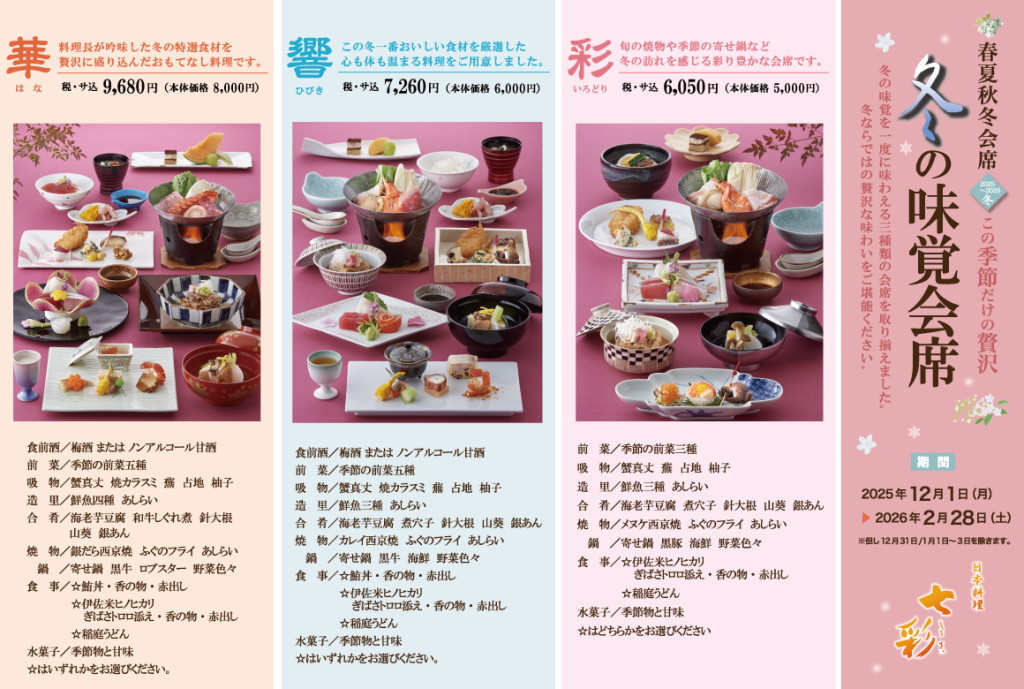 冬の味覚を一度に味わえる三種類の会席料理を取り揃えました。