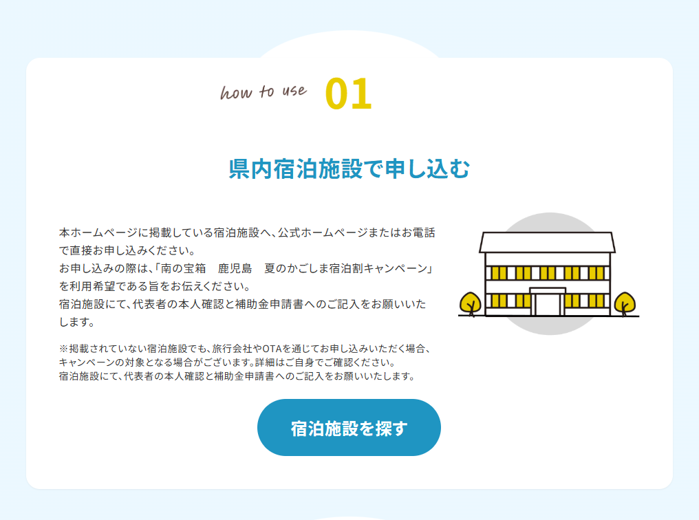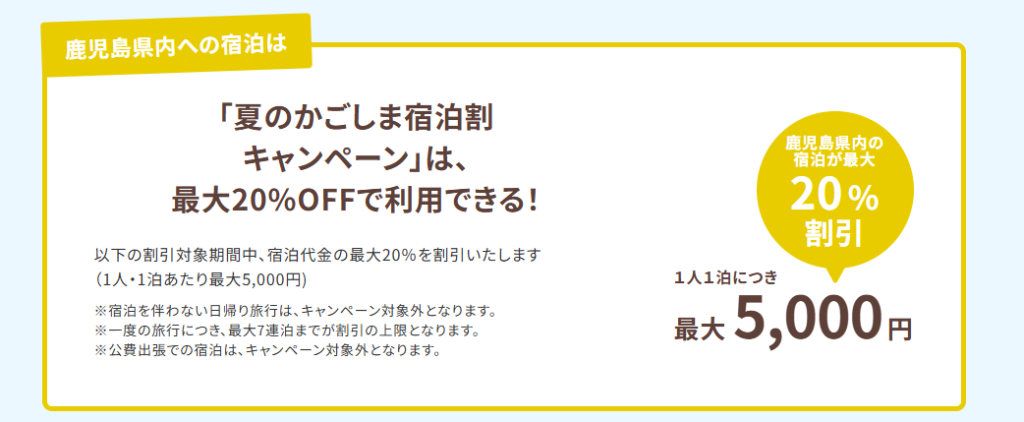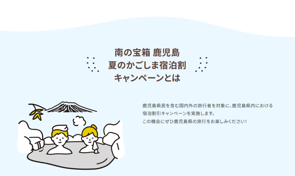 2026.4.6 『 南の宝箱 鹿児島 夏のかごしま宿泊割キャンペーン 』 に関して 鹿児島サンロイヤルホテルは『南の宝箱 鹿児島 夏のかごしま宿泊割キャンペーン』に参画しております。 当ホテルのご予約はこちらから☎ 099-253-2020(鹿児島サンロイヤルホテル)お問い合わせ先:南の宝箱 鹿児島 夏のかごしま宿泊割キャンペーンコールセンター電話番号:050-3667-1619メール:syukuwari_kagoshima@jbx.jtb.jp受付時間:9:00~17:00 (全日営業) Tweet Categories: PICK UP, イベント, お知らせ, コンシェルジュ, 宿泊 « 前の記事次の記事 » よくある質問 採用情報 コンシェルジュ イベント おすすめプラン スタッフブログ レストラン 宿泊 ウエディング 宴会/会議