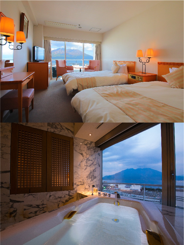 All guest rooms, except for single rooms (city-view side), boast panoramic views of Sakurajima.