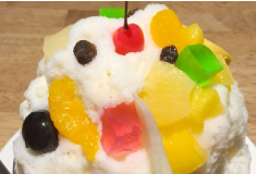 ◆白熊…一般的に「白熊」とは、削りたての氷に練乳をかけ、フルーツや豆類を盛り付けたかき氷の事を言います。その顔が白熊の顔に見えることから名付けられました。